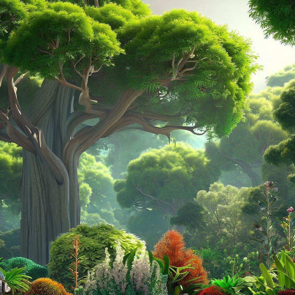 trees with green vegetation and flowers. 4k, ultra hd, intricately-detailed