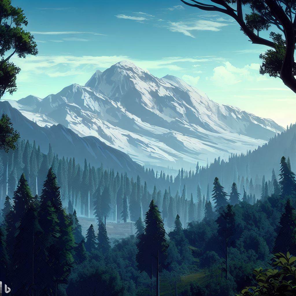 landscape forest with mountain with view from the forest towards the snowy mountain with a blue sky Intricately-detailed. 4k, ultra definition