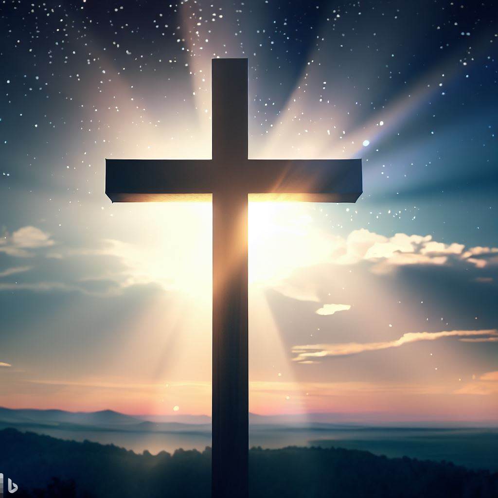 christian cross with backlight shining on a beautiful landscape with evening sky. 4k, ultra definition, astrophotography