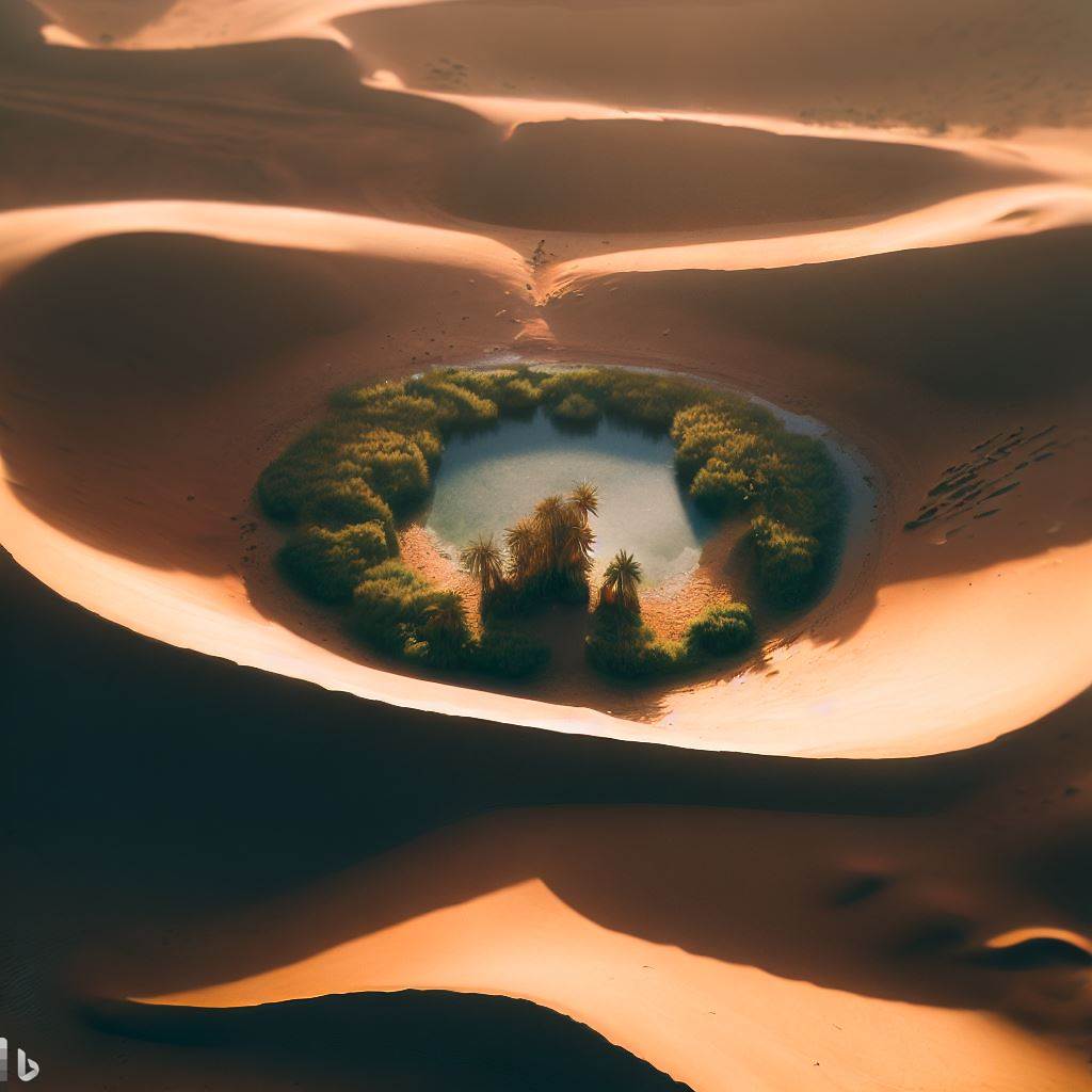 oasis in the middle of the desert looking at it from a dune located in the height. Real, Cinematic, lightting, 4k, ultra definition, specific, Aerial photography