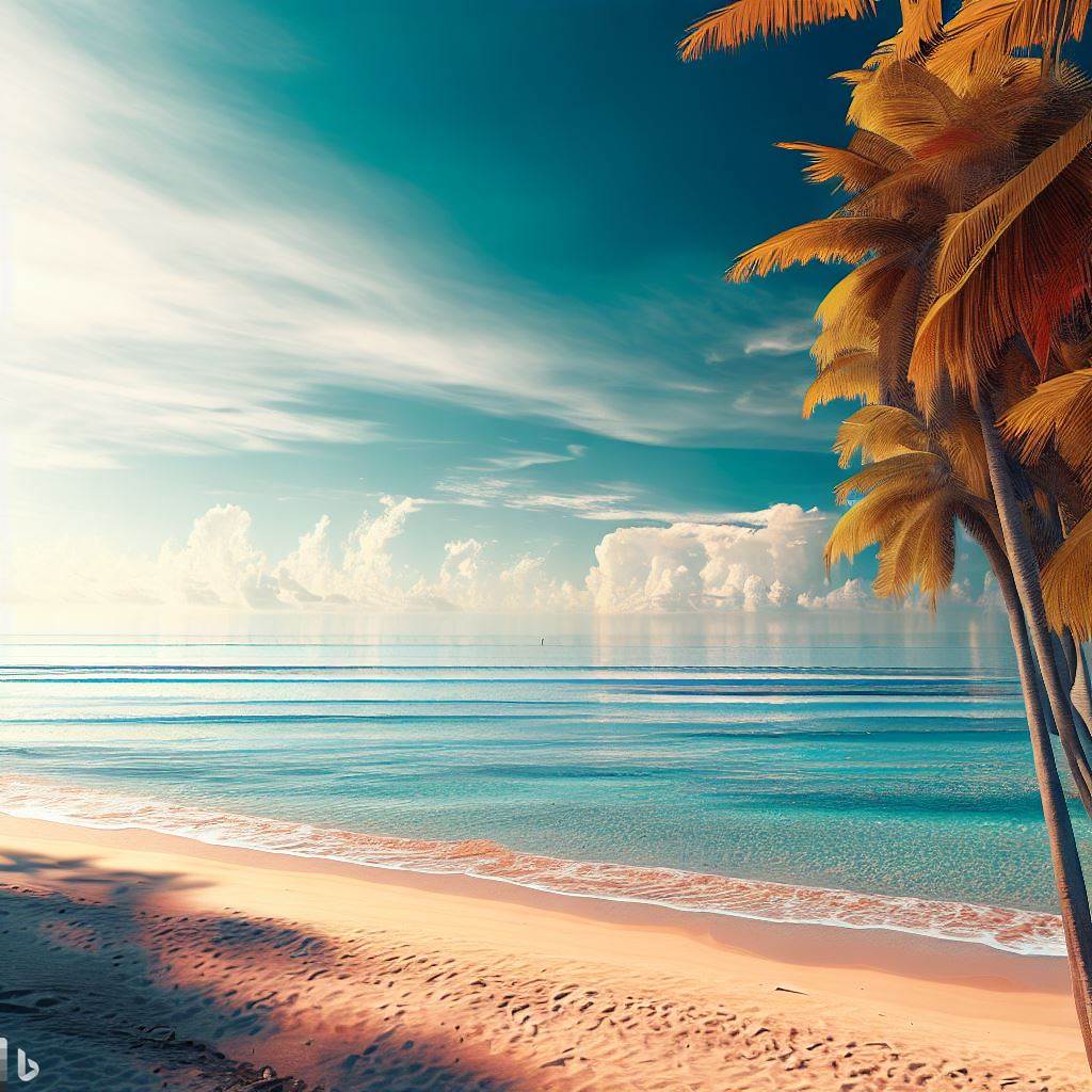 beach with palm trees and a blue sky with a view from the beach to the warm sea. 4k, Real, Cinematic, ultra definition, specific